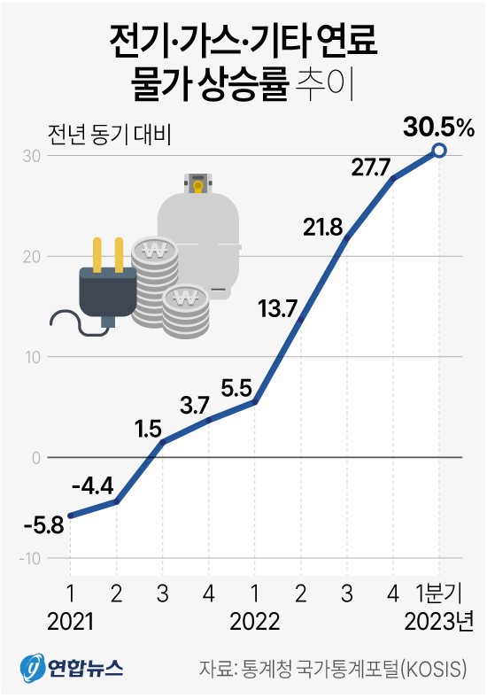 지난해 전기요금은 세 차례(4·7·10월)에 걸쳐 kWh(킬로와트시)당 19.3원 올랐고, 올해 1월에도 13.1원 인상됐다. 도시가스 요금도 지난해 4차례에 걸쳐 MJ(메가줄)당 5.47원 인상됐다.