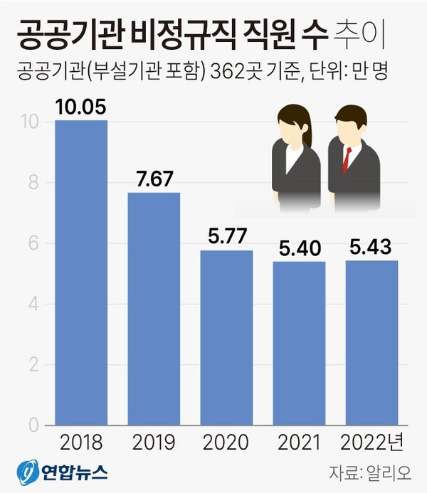 공공기관 비정규직 직원 수는 정규직 전환이 진행되면서 연말 기준으로 2018년 10만 483명, 2019년 7만 6668명, 2020년 5만 7650명, 2021년 5만 3960명 등 지속적으로 줄다가 지난해 증가세로 돌아섰다.