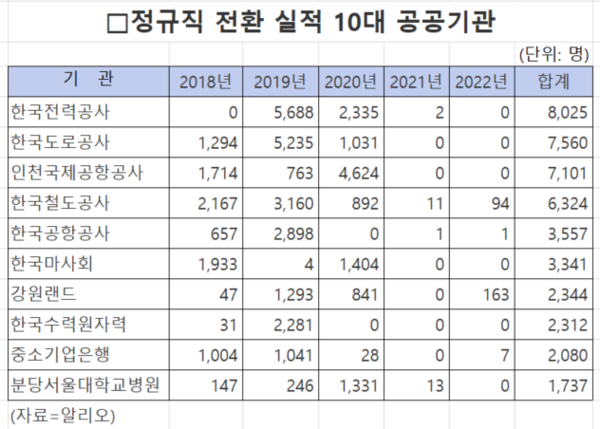 지난 2018년부터 지난해까지 5년 동안 정규직 전환실적이 가장 많은 공공기관은 한국전력공사로 8025명이었다.