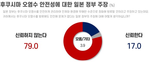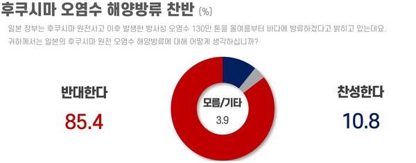 일본 후쿠시마 원전 오염수 해양 투기에 대해 국민 85.4%가 반대한다고 답했다. ‘오염수를 방류해도 안전에 문제가 없다’는 일본 정부의 주장에는 79%가 ‘믿을 수 없다’고 응답했다.
