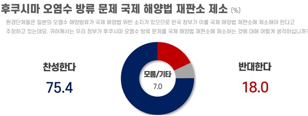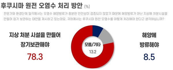 오염수 처리 방안에 대해서는 ‘지상 처분 시설을 만들어 장기 보관해야한다’고 답한 비율이 78.3%에 이르렀다. ‘해양에 방류해야 한다’는 8.5%에 그쳤다. 오염수 투기 문제를 ‘국제 해양법 재판소 제소하는 방안’에 대해서는 찬성이 75.4%, 반대가 18%였다.