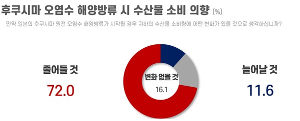 오염수가 바다에 투기될 경우 ‘수산물 소비량에 어떤 변화가 있을 것으로 생각하냐’는 물음에는 72%가 ‘줄어들 것’이라고 답했다. ‘늘어날 것’이라는 대답은 11.6%였다.