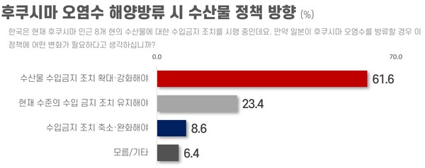 현재 한국 정부는 후쿠시마 인근 8개 현의 수산물에 대해 수입을 금지하고 있다. 응답자들은 ‘일본 정부가 오염수를 투기할 경우 이 정책에 어떤 변화가 필요하다고 생각하냐’는 물음에 61.6%가 ‘수입 금지 조치를 확대·강화해야 한다’, 23.4%는 ‘현재 수준의 수입 금지 조치를 유지해야 한다’고 답했다.