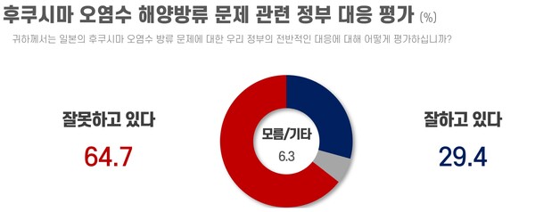 오염수 투기 문제에 관한 정부 대응에 대해서는 64.7%가 ‘잘못하고 있다’, 29.4%가 ‘잘하고 있다’고 답했다. 자기 정치 성향이 보수라고 답한 응답자 중 절반에 가까운 46.3%가 ‘잘못하고 있다’고 답한 부분이 눈에 띈다. ‘잘하고 있다’고 답한 비율은 46.6%였다. 반면 정치 성향이 진보라고 답한 응답자 중 정부 대응에 대한 부정 평가는 80%, 긍정 평가는 16.6%였다. 김춘이 환경운동연합 사무총장은 “여론조사 결과를 보면 오염수 방류 반대에 진영이 따로 없다”고 평가했다.