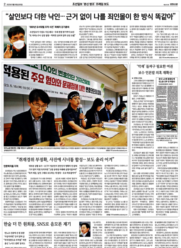 “‘노동 혐오’ 드러낸 섬뜩한 ‘보도폭력’”(경향신문, 5월19일 1면)/“살인보다 더한 낙인...근거 없이 나를 죄인몰이 한 방식 똑같아”/“‘악재’ 돌파구 필요한 여권/보수 언론발 의혹 재확산”/ “취재 경위 부정확, 사진에 시너통 합성...보도 윤리 어겨”/“한술 더 뜬 원희룡, SNS로 음모론 제기”(2면)/“건설노동자 분신 악마화한 조선일보야말로 ‘언폭’이다”(사설)