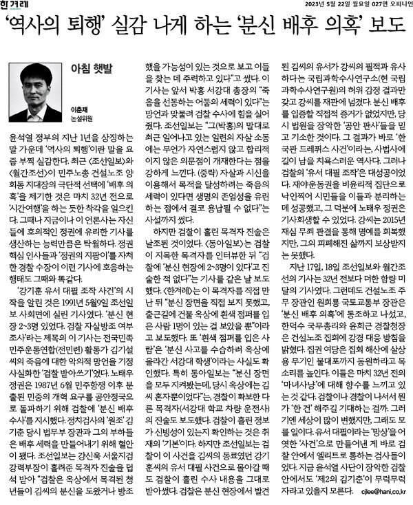 노동절인 지난 1일 윤석열 정부의 ‘건폭몰이’ 노조 탄압에 항의하다 분신한 양회동 씨 죽음은 충격적이다. 군사독재 시절 벌어진 숱한 죽음을 떠올리게 했기 때문이다. 그러나 이보다 더 충격적이었던 것은 조선일보의 느닷없는 ‘분신방조 의혹 제기’ 보도였다.