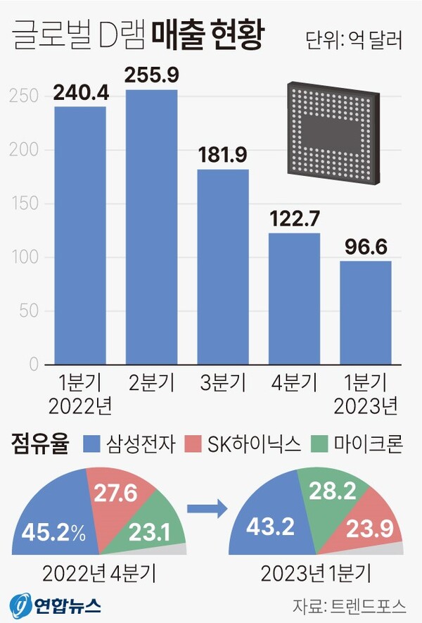삼성전자와 SK하이닉스는 글로벌 D램 시장 점유율에서 작년까지 세계 1, 2위였으나, 올해 1분기에는 삼성전자가 1위를 지킨 가운데, 마이크론이 SK하이닉스를 제치고 2위에 올랐다.