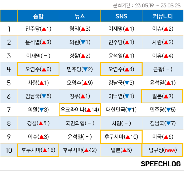 ‘민주당’키워드 순위가 1위로 상승한 것은 김남국 이슈, 검찰의 당대표 선거 수사, 후쿠시마 시찰단 비판, 고 노무현 전 대통령 14주기 행사 등이 언론에서 집중되었기 때문이고, ‘윤석열’ 키워드가 2위로 상승한 것은 한일정상회담, 젤렌스키와의 정상회담 등 G7 정상회의가 언론에서 집중 보도된 영향으로 해석된다.