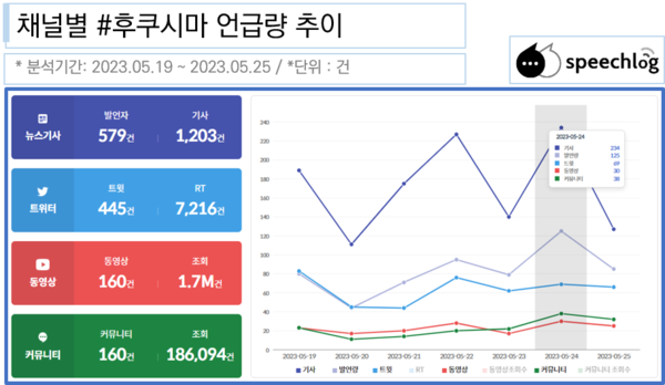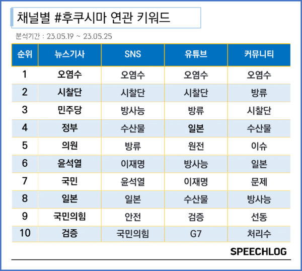 ‘후쿠시마’ 키워드는 G7정상회의가 기간인 20일 감소했다가 24일 최고 버즈량(언급량)을 기록했다. 뉴스채널에서 다시 감소 추세를 보이고 있지만 SNS, 유튜브, 커뮤니티에서는 지속적 관심 이슈임을 버즈량을 통해 확인할 수 있다.