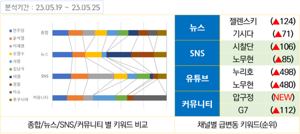 ‘우크라이나’ 키워드가 뉴스채널에서 14계단 상승해 7위에 올라선 것은 G7정상회의에서 진행된 정상회담이 집중 보도되고, 포탄지원 관련 소식이 전해진 것에 따른 것으로, ‘젤렌스키’ 키워드와 함께 급상승했다. SNS에서는 ‘시찰단’ ‘노무현’ 키워드가, 유튜브에서는 ‘누리호’ ‘노무현’ 키워드가 급상승했다. 커뮤니티에서는 ‘압구정’ 키워드가 새롭게 등장했고, ‘G7’ 키워드도 급상승한 것으로 나타났다.