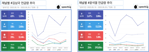 ‘김남국’키워드는 20일 최소 버즈량을 기록했다가 다시 언급량이 늘어났지만 뉴스외의 채널에서는 최고치의 버즈량을 기록했던 2주 전보다는 확연하게 줄어든 것으로 나타났다. ‘윤석열’ 키워드는 G7정상회의 이후인 22일 최고 버즈량(언급량)을 보였다.