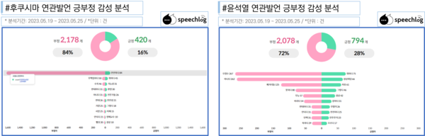 ‘윤석열’키워드에 대한 긍정 및 부정어 분석 결과, 긍정 감성어는 28%(794개)로 윤석열 지지율보다 10% 정도 낮았다. 부정 감성어는 72%(2078개)에 달했고, ‘오염수’ ‘아니다’가 높게 나타났다.