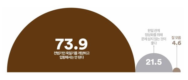 여론조사꽃이 26~27일 전국 18세 이상 성인남녀 1012명을 대상으로 전화면접조사를 실시한 결과에 따르면 자위대 군함이 욱일기를 달고 부산항에 입항하는 것에 대해 응답자의 73.9%가 '전범기인 욱일기를 게양한 채 입항해서는 안 된다'고 답했다. '한일 관계 정상화를 위해 문제 삼지 않는 것이 좋다'는 응답은 21.5%에 그쳤다.