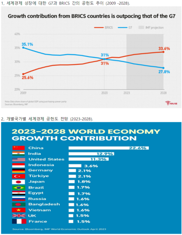 헨리 키신저는 나토와 같은 군사조직을 단기 승부에 집착하는 서양식 장기로 비유하는 반면에, 중국이 취하는 경제협력 전략은 장기적 관점에서 실리와 세력의 균형을 추구하는 동양의 바둑과 같다고 평한 바 있다. 탁견이다! 또한 최근 IMF 등이 발표한 통계자료가 세계인의 주목을 크게 받고 있다. 아래 2개의 도표에서 보듯이, 세계경제 공헌도에 대하여 G7과 BRICS 간 비교 추이와 개별 국가별 비중이 제시되었다.