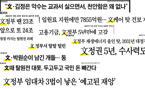 기사·칼럼·사설의 제목을 보면 전임 대통령에 대한 비난, 조롱 일색이다. 공격 대상을 향해 ‘집요하게’ 가해지는 혐오와 저주가 느껴진다. 조선일보에 따르면 ‘문재인 정부 탓에 건강보험 재정이 급속 악화’되었고, ‘문재인 정부 탓에 대(大)정전 사태가 올 것’이며, ‘문재인 정부 탓에 전기료가 오르게’ 됐다.