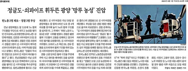 그러나 여러 언론에 보도된 고공농성 한국노총 간부에 대한 경찰 진압 뉴스를 보면 대통령실 국정기획수석의 ‘기울어진 운동장’ 주장은 도무지 납득하기 힘들다. ‘둔기 든 금속노련 간부 구속’(TV조선), ‘쇠파이프 저항에 경찰봉 제압’(채널A), ‘경찰에 쇠파이프 폭력’(한경, 서경, 국민), ‘범죄도시 악당 휘두르던 정글도 등장’(매경), ‘정글도·쇠파이프 휘두른 광양 망루 농성 진압’(조선), ‘42㎝ 칼 휘두르다 경찰봉 맞았다’(중앙) 등 여러 언론들이 농성 노동자가 무장한 경찰 4명에 저항하는 영상을 부각하거나 쇠파이프와 칼, 특히 ‘정글도’를 휘둘렀다는 내용을 보도했다. 반면, 한겨레, 경향, MBC, JTBC, KBS, YTN 등은 경찰의 ‘과잉진압’에 초점을 맞춰 보도했다. 이런 보도가 ‘기울어진 운동장’을 말할 정도로 ‘일방적이고 과도한’ 언론의 정권 비판 보도였을까?