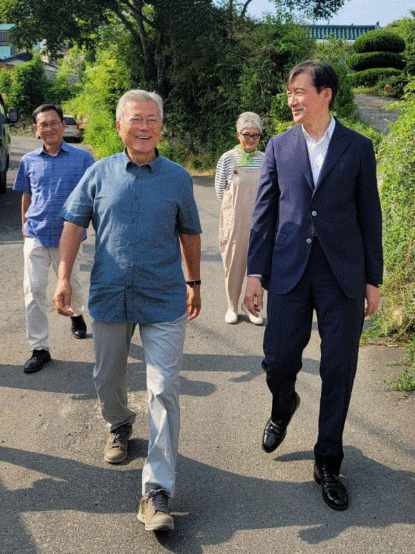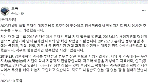서울로 돌아온 조 전 장관은 이날밤 문 전 대통령과의 조우기(遭遇記)를 페이스북에 올렸다. 가족과 함께 겪고 있는 고초에 대한 일단의 심경도 털어놨다. 문 전 대통령과 찍은 사진도 여러 장 올렸다. 페이스북에 글을 올린 건 올들어 두번 째다.