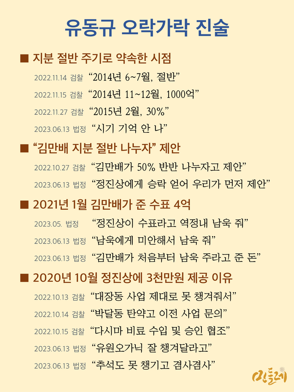 2022년 11월 14일과 15일 조사에서 “2014년 6~7월 김만배 지분의 절반", “2014년 11~12월 1000억원"이라고 진술했던 유 전 본부장은 약 2주 뒤인 11월 27일 조사에서는 “2015년 2월 나와 정진상, 김용의 지분이 약 30%, 김만배가 10몇%라고 김만배가 얘기해줬다. 김만배가 남욱, 정영학, 저를 불러 각자 지분을 설명해줬고, 이를 토대로 나는 정진상과 김용에게 설명했다"고 진술했다.