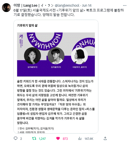 북토크 사회를 맡기로 했던 작가 겸 가수 이랑도 도서전 불참을 선언했다. 이랑은 폭력 사태가 일어난 개막일인 14일 트위터에 “6월 17일(토) 서울국제도서전 <기후위기 앞의 삶> 북토크 프로그램에 불참하기로 결정했습니다. 양해의 말씀 전합니다”라는 글을 올렸다.