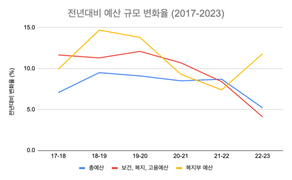 그러나 정부가 제출한 새해 예산안을 살펴보면 보건 복지 고용 분야 예산은 226.6조원으로 올해 본예산보다 8.9조원(4.1%) 늘어나는 데 그쳤다. 총예산 증가율(5.2%)을 밑도는 수준이기도 하고 물가상승도 반영하지 못할 것이란 지적을 받고 있다. 이는 문재인 정부 5년간 평균 증가율 10.5%의 절반에도 미치지 못하는 증가율이다. 더구나 법정 자연증가분이 상승분의 대부분을 차지하고 있어서 실질적 복지예산은 오히려 감소한 수준이라는 평가까지 나오고 있는 실정이다.