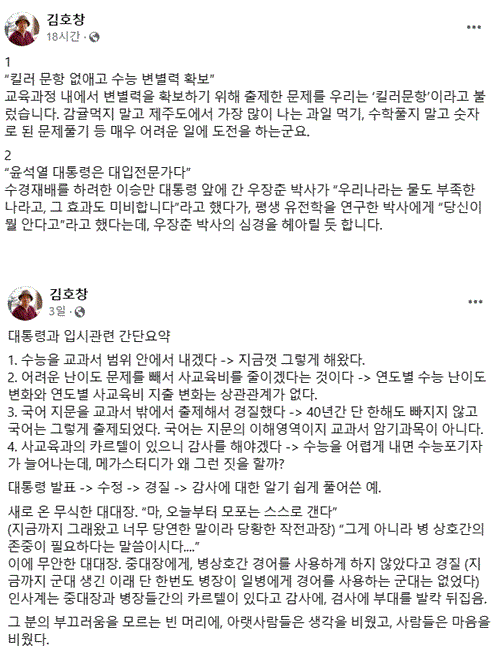 “술 취한 동네 할아버지도 하지 않을 뻘소리를 대통령이 하면, 옆에서 누군가 지적을 해줘야지, 뻘소리를 현실화하려고 정말 노력들을 많이 하십니다. 경질을 하고, 사임을 하고, 감사를 하고, 뭔 짓을 해도 좋습니다. 정말 국어과목을 암기과목으로 만들어도 좋습니다. 사교육을 때려잡아도 좋습니다. 제발 부탁인데, 올해 수능 치는 아이들은 건드리지 맙시다. 대학도 요강 바뀌면 3년 전에 예고하라고 한 사람들이 당신들 아닙니까? 그럼 최소한 아이들이 대비할 시간은 줘야 하는 것 아닙니까? 이 나쁜 애만도 못한 어른들아.” (김호창 업스터디 대표)