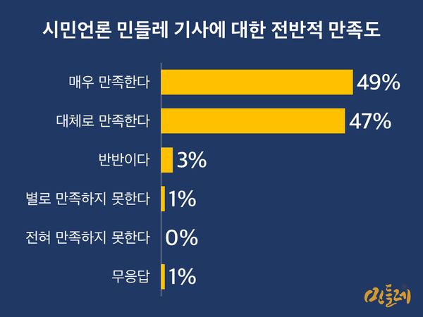 먼저 '민들레' 기사의 만족도 조사에서는 ‘매우 만족한다’ 49%(1344명), ‘대체로 만족한다’ 47%(1293명)로 96%가 긍정적으로 평가했다. 창간 6개월 동안의 노력이 독자들로부터 좋은 평가를 받고 있음을 확인할 수 있는 대목이다. 이어 긍정도 부정도 아닌 ‘보통이다’는 응답은 3%(86명), ‘별로 만족하지 못한다’ 1%(14명). ‘전혀 만족하지 못한다’는 응답이 0.1%(4명)였다. 4%에 달하는 비만족 평가는 잘하라는 충고와 격려로 겸허히 받아들인다.
