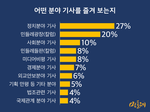 ‘어떤 기사를 즐겨 읽는지’에 대한 설문 결과(복수 응답) 정치 분야가 27%(2289명), 30여 명의 외부 필자들이 포진한 '민들레 광장'이 20%(1704명)를 차지했다. 이어 법조를 포함한 사회 분야가 14%(1174명)였고, 외교·안보 분야 10%(846명), '민들레 들판' 8%(655명), 미디어비평 8%(647명), 경제 분야 7%(615명), 만평 5%(439명) 순이었다. 생산 주체 즉 스태프-외부필진으로 구분해 보면 6.6 대 3.3으로 나타나 민들레 사이트의 페이지뷰 구성비 6.5 대 3.5와 엇비슷하다.