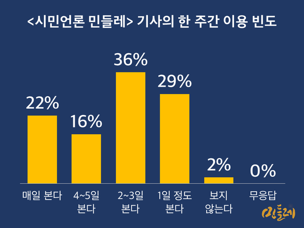'민들레' 기사 이용 빈도 조사에서는 ‘매일 기사를 본다’는 응답자가 22%, ‘일주일에 4~5일 기사를 본다’는 응답자가 16%로 이용 빈도가 높은 애독자가 38%를 차지했다. 일주일에 2~3일 정도 기사를 본다는 독자는 36%였고, 하루 정도 기사를 읽는다는 응답자는 23%였다. 모든 독자들이 매일 '민들레' 기사를 찾아 볼 수 있도록 더 많은 노력이 필요하다는 점을 시사하고 있다. 매일 접속하는 '민들레' 사이트 방문자 가운데 신규 방문자와 재방문자의 비율은 4.5대 5.5 정도로 재방문자가 조금 많아 독자들의 충성도는 높은 편이다.