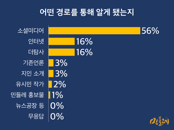 '시민언론 민들레'를 어떻게 알게 됐는지를 살펴봤다. 응답자의 56.6%가 유튜브나 페이스북, 트위터를 통해 알게 됐다고 밝혔다. 구글 등 인터넷 상에서 '시민언론 민들레' 기사를 통해 알았다는 독자는 16.3%. '시민언론 더탐사' 방송을 통해 알았다는 응답자는 15.8%였다. 따라서 SNS 등 뉴미디어를 통해 알았다는 독자가 87.7%를 차지했다. 지인의 소개로 알았다는 응답자는 3%였고, '민들레'에 격주로 칼럼을 연재하고 있는 유시민 작가를 통해 알게 됐다는 응답자도 2%였다. '시민언론 민들레' 자체 홍보물을 통해 알았다는 응답자 역시 2%였다. 이 밖에 뉴스공장 등 다양한 매체를 통해 알게 됐다는 답변도 있었다.