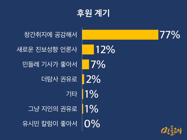 조사에 응한 2759명 가운데 '시민언론 민들레'에 후원을 하고 있는 후원자는 68%인 1880명으로 조사됐다. 후원자의 94%가 정기후원 독자였다. 후원을 하게 된 계기는 ‘창간 취지가 좋아서’라는 답변이 77%로 압도적 1위를 차지했다. ‘진보언론사여서’라는 응답은 12%, ‘기사 콘텐츠가 좋아서’라는 답변도 7%를 차지했다. 나머지 4%는 유시민 칼럼이 좋아서, 더탐사의 권유, 지인의 권유로 후원하게 됐다고 답했다. 창간 취지를 견지하는 것이 '민들레'가 앞으로 나아가야 할 방향이라는 것을 재확인할 수 있었다.