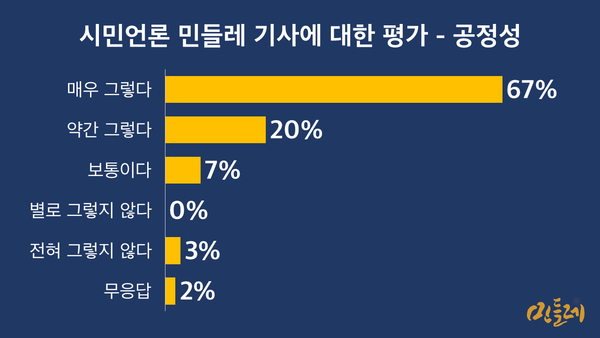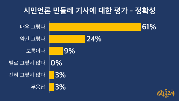 또한 '민들레' 기사가 사실에 근거해 정확하다는 정확성 측면에서는 ‘매우 그렇다’ 61%(1685명), ‘약간 그렇다’ 24%(655명)로 긍정 평가가 85%를 차지했다. 긍정도 부정도 아닌 ‘보통이다’는 9%(243명)였고, ‘별로 그렇지 않다‛ 0.2%(6명), ’전혀 그렇지 않다’ 3%(86명), 무응답 3%(86명) 등이었다. 절대 다수가 '민들레' 기사나 칼럼을 공정하고 정확하다고 응답해 ‘진실 보도’라는 저널리즘의 기본 원칙을 잘 지키는 ’대안언론’ ’대항언론’으로서 자리매김하고 있다는 청신호로 받아들여졌다.