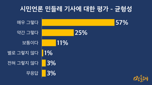 균형성 측면에서는 ‘매우 그렇다’ 57%(1574명), ‘약간 그렇다’ 25%(586명)로 긍정 평가가 82%를 차지했다. 긍정도 부정도 아닌 ‘보통이다’는 답변은 11%( 297명)로 나타났다. 부정평가는 4%, 무응답은 3%(82명)로 집계됐다. 뒤에서도 살펴보겠지만, 여러 평가항목 가운데 균형성 측면이 82%로 다른 항목에 비해 큰 차이는 아니지만 조금 낮았다. 대안언론으로서 보다 분명한 시각을 가져야 한다는 채찍일 수도 있고, 편향이라는 지적일 수도 있다.