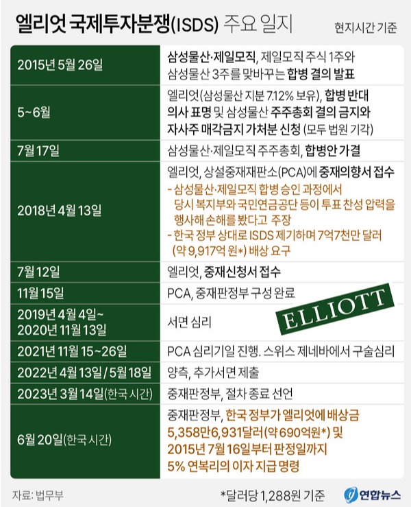 이런 재판 결과는 엘리엇 측의 주장을 뒷받침하는 데 핵심적으로 작용했다. 엘리엇은 심지어 지난 20일(현지시각) 발표한 입장문에서 "이번 중재 판정으로 정부 관료와 재벌 간의 유착관계로 인해 소수 주주들이 손실을 보았다는 사실이 재차 확인됐는데, 이는 윤석열 대통령과 한동훈 법무부 장관이 검찰 재직 당시 수사 및 형사 절차를 통해 이미 입증한 바이기도 하다"며 "대한민국이 이번 중재판정 결과에 승복하고 배상 명령을 이행하기를 바란다. 불복하면 추가적인 소송 비용 및 이자를 발생시켜 한국 국민의 부담만 늘어나게 될 것"이라고 충고했다. 윤석열 대통령과 한동훈 장관을 콕 집어 '당신들이 수사해서 처벌한 사안 아니냐'고 조롱하며 빨리 돈이나 갚으라는 투다.