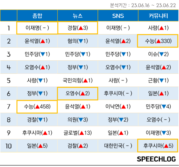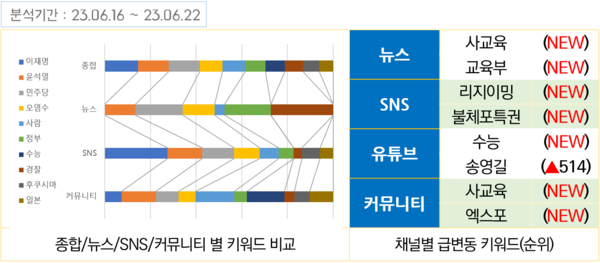 6월 셋째주 커뮤니티에서는 ‘수능’ 키워드가 무려 330단계 뛰어올라 언급량 2위를 기록했다. 언론 뉴스, 유튜브 등에서도 ‘수능’ ‘사교육’ 등 관련 키워드가 처음 출현하고 높은 순위에 오르는 바람에, 전체적으로 ‘수능’ 키워드는 단번에 종합 7위를 기록했다.