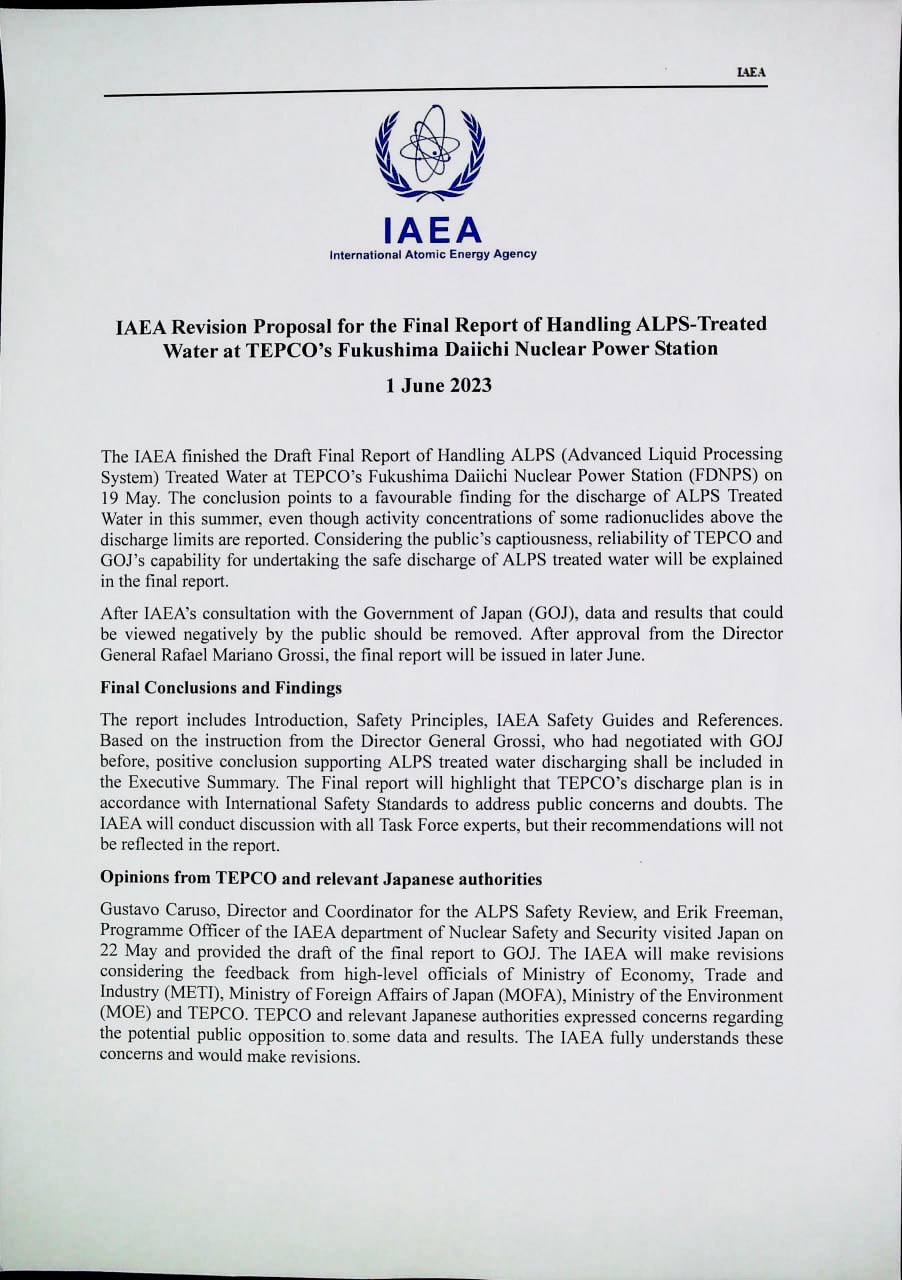 IAEA는 5월 19일에 도쿄전력 후쿠시마 제1원전 ALPS(선진 액체처리 시스템) 처리수 처리에 관한 최종보고서 초안을 완료했다. 그것은 일부 방사성 핵종의 활성농도가 방류 허용치를 넘은 것으로 보고됐지만, ALPS 처리수를 올해 여름에 (해양) 방류하는 것이 유리하다는 결론을 내렸다. 대중의 까다로움을 고려해서, 도쿄전력의 신뢰성과 ALPS 처리수의 안전한 방류를 위한 일본정부의 수행능력을 최종보고서에서 설명할 것이다.