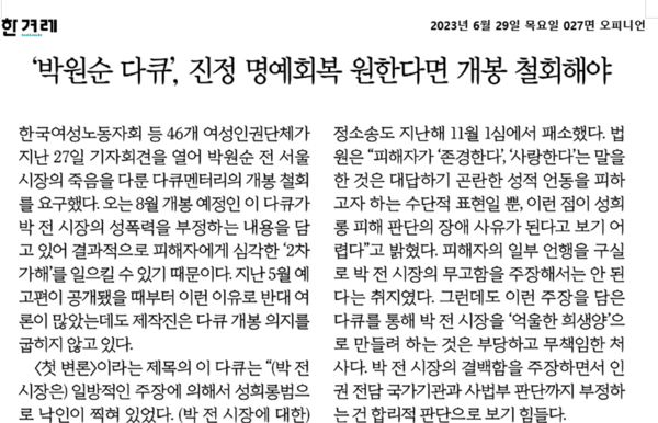 한겨레 사설은 박 시장이 살아 있다면 다큐의 개봉을 바라지 않았을 것이라는 단언까지 하고 있다. 고인의 속마음을 읽기라도 한 듯 실로 대담무쌍한 주장이며 논리다. 그러나 설령 박 시장의 뜻이 그렇다고 하자. 하지만 이 사안이 박 시장 그 개인만의 문제인 것인가. 이 사안에 대한 질문 제기가 허용돼야 하는 것은 이 문제가 결코 박원순 개인에 대한 신원이나 그 혼자의 명예회복에 머무르지 않는 것이기 때문이기도 하다.