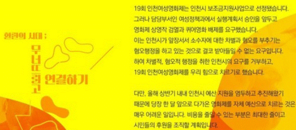 인천시는 지난달 16일 공문을 보내 ‘퀴어 등 의견이 분분한 소재 제외’를 또다시 요구했다. 인천시 백보옥 여성정책과장은 “여성영화제는 아이들도 많이 볼 수 있어 퀴어 영화보다는 여성영화제 취지에 맞는 여성 인물 중심의 영화로 조절이 필요하다고 판단했다”며 “상영작 검열이 아닌 관리였을 뿐이고 혐오 발언을 한 사실이 없다”고 해명했다.