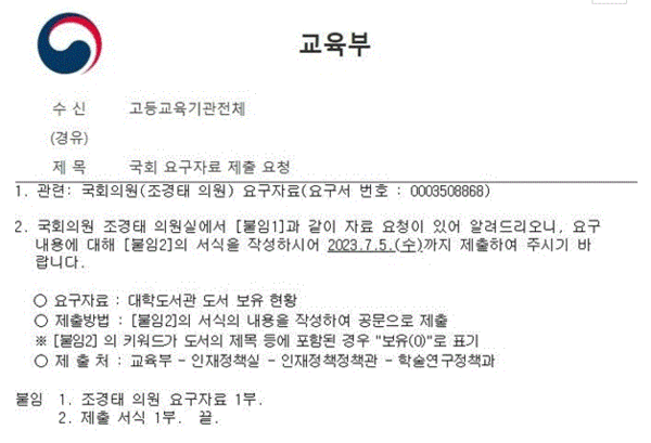 조경태 의원은 시도교육청을 통해 전국 고교에도 같은 자료를 요구한 것으로 확인됐다. 고등학교 도서관도 뒤지겠다는 것이다. 자료 제출 마감 시한은 6월 28일이었다.