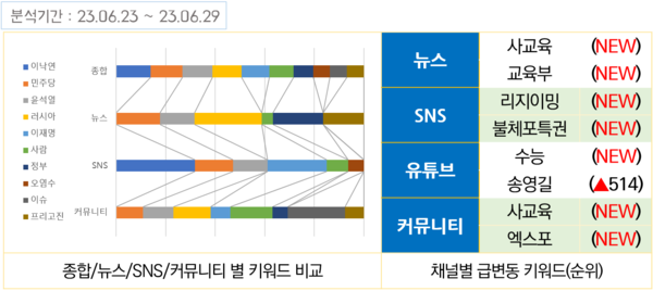 이밖에 언론과 유튜브, 커뮤니티에서 지난주에 이어 ‘사교육’ ‘교육부’ ‘수능’ 키워드가 급상승했다. 교육부와 일부 ‘친윤 언론’들이 윤석열 대통령의 ‘쉬운 수능’ ‘킬러문항’ 돌출발언이 초래한 입시 혼란을 덮어버리기 위해 ‘사교육 카르텔 해체’ 프레임의 기획기사를 계속 보도하고 있기 때문으로 분석된다.