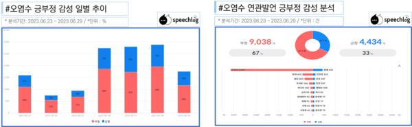 SNS에서 ‘오염수’ 키워드는 4단계 하락했지만 8위로 10위권 내를 유지했다. 연관발언 긍부정 감성 분석에서도 부정 반응이 67%로 긍정 33%의 두배가 넘게 나타났다.