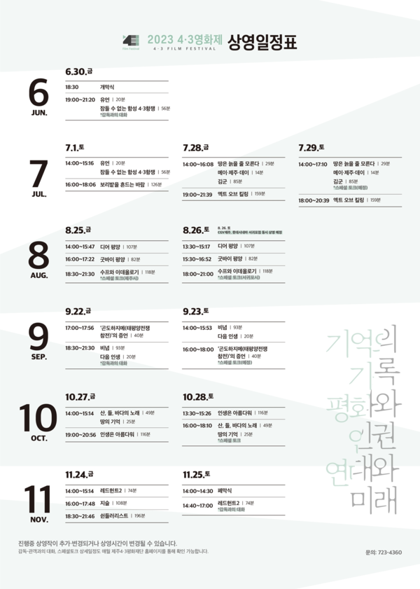 4·3영화제는 7월 28일과 29일에 1965년 인도네시아 대학살을 그린 <액트 오브 킬링>(2014, 조슈아 오펜하이머), 4·3단편영화 <땅은 늙을 줄 모른다>(2022, 김지혜)와 <메이·제주·데이>(2022, 강희진), 5·18광주민주화운동의 진실을 밝히는 <김군>(2019, 강상우)이 상영된다.