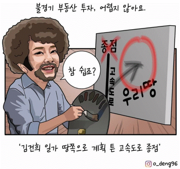 오뎅 작가는 김건희 씨를 화가로 변신시켰다. 김 씨는 그림 속에서 “불경기 부동산 투자, 어렵지 않아요”라고 말하고 있다. EBS 인기 프로그램이었던 <밥 로스의 그림을 그립시다> 패러디다. ‘밥 아저씨’는 ‘쉬운 그림 그리기’를 가르치며 수시로 “참 쉽죠?” “어렵지 않아요”라는 유행어를 남겼다.
