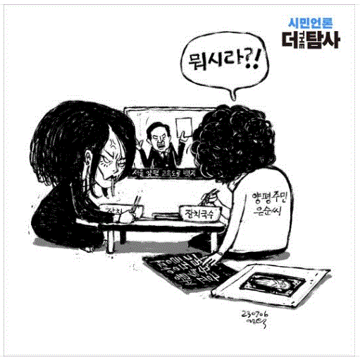 백영욱 작가는 6일 시민언론 더탐사 사이트 ‘촛불갤러리’ 코너에 <파토 국수>를 올렸다. 원희룡 장관이 ‘백지화 선언’을 하자 윤석열 대통령 부인 김건희 씨와 장모 최은순 씨가 “뭐시라?!” 하며 깜짝 놀란다.