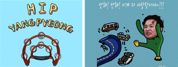 이하 작가는 두 편의 만평을 연이어 선보였다. <밥상머리 교육의 중요성>을 보니 ‘원희룡 어린이’가 땡깡을 부리며 밥상을 엎어버리고 있다. ‘사업 백지화’를 빗댄 풍자 그림이다. <힙 양평>에는 탬버린이 등장한다. 탬버린은 과거 김건희 씨가 연주했다는 악기다.