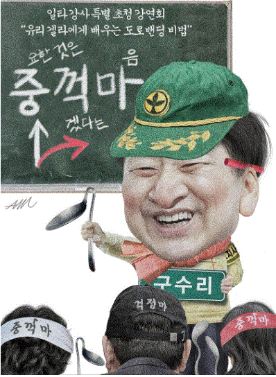 아트만두 작가는 김기현 국민의힘 대표를 소재삼아 <중꺽마>를 그렸다. 김 대표가 일타강사로 나서 ‘도로 벤딩(bending)의 비법’을 가르친다. ‘구수리’는 김 대표 땅이 있는 동네 이름이다. 9필지 11만 5427㎡(3만4921평)로 울주군 언양읍에 있다.
