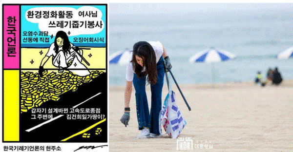 그런가하면 박건웅 작가는 <한국 기레기 언론의 현주소>라는 만평을 그렸다. 김건희 씨가 쓰레기 줍는 줄 알았는데, 알고보니 고속도로 종점을 바꿔 황금을 줍고 있다. 김건희 씨는 지난 3일 강릉 경포해변을 찾아 바닷가 쓰레기 줍기 봉사활동을 했다. ‘후쿠시마 핵 오염수가 바다에 투기될 마당에 바닷가 담배꽁초나 치울 때냐’는 비아냥이 나왔다.