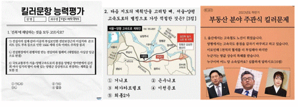 독립 언론 ‘아이엠피터뉴스’를 운영하는 임병도 기자는 6일 <이 셋 중에 누가 진짜 '건폭'인가?>라는 제목의 기사를 내보내며 독자들에게 ‘킬러문항 능력평가’ 문제도 냈다.(맨왼쪽) 세번째를 보니 ‘국토교통부가 서울-양평 고속도로의 종점을 양평군 양서면에서 김건희 여사 일가의 땅이 속해 있는 양평군 강상면으로 변경하는 계획을 검토한 것’이다. 정답은 물론 ②다. 온라인에는 네티즌들이 만든 것으로 보이는 다른 ‘킬러 문항’ 패러디 문제도 나돌고 있다.