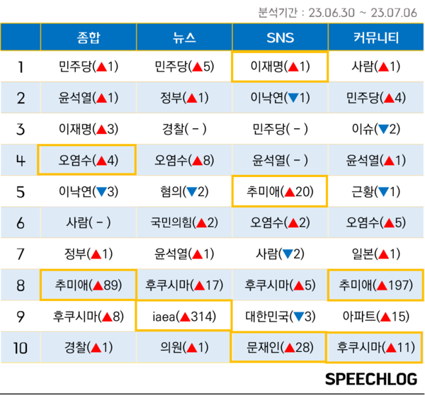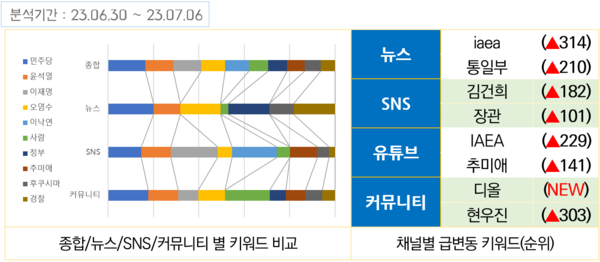 7월 첫주 여전히 일본 후쿠시마 핵 오염수는 언론과 SNS, 커뮤니티, 유튜브 등 모든 뉴스 플랫폼에서 뜨거운 이슈였다. ‘오염수’ ‘후쿠시마’ ‘IAEA’ 등의 키워드는 지난주 다른 키워드에 비해 언급량이 크게 늘면서 순위에서 일제히 상승했다.