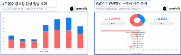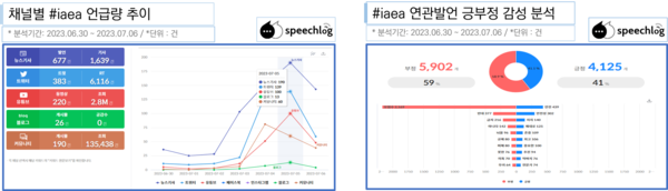 ‘IAEA’ 연관발언의 긍부정 분석 결과에서는 부정어가 59%로 긍정어 41%보다 높았다. 부정어로는 ‘반대’ ‘금지’ ‘아니다’ ‘뇌물’ 등이 많았고, 긍정어로는 ‘안전’ ‘안전성’ ‘지지’ 등이었다. ‘오염수’ 관련 긍정어와 부정어는 전주와 같은 67%, 33%로 전주와 같이 부정어가 긍정어의 2배에 달했다.