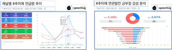 이밖에 ‘추미애’ 키워드의 급등이 눈에 뜨인다. 추미애 전 법무부 장관이 한 인터뷰에서 ‘문재인 대통령이 자신을 물러나게 했다’고 발언한 탓이다. SNS와 커뮤니티에서 ‘추미애’는 단번에 10위권에 진입했고, 유튜브에서도 229단계 급상승했다. 추미애 전 장관의 발언에 대해 디지털 뉴스 플랫폼 이용자들은 ‘추 장관의 무책임한 폭로’과 ‘문재인 대통령의 잘못된 인사’로 나뉘어 논쟁을 벌였다.